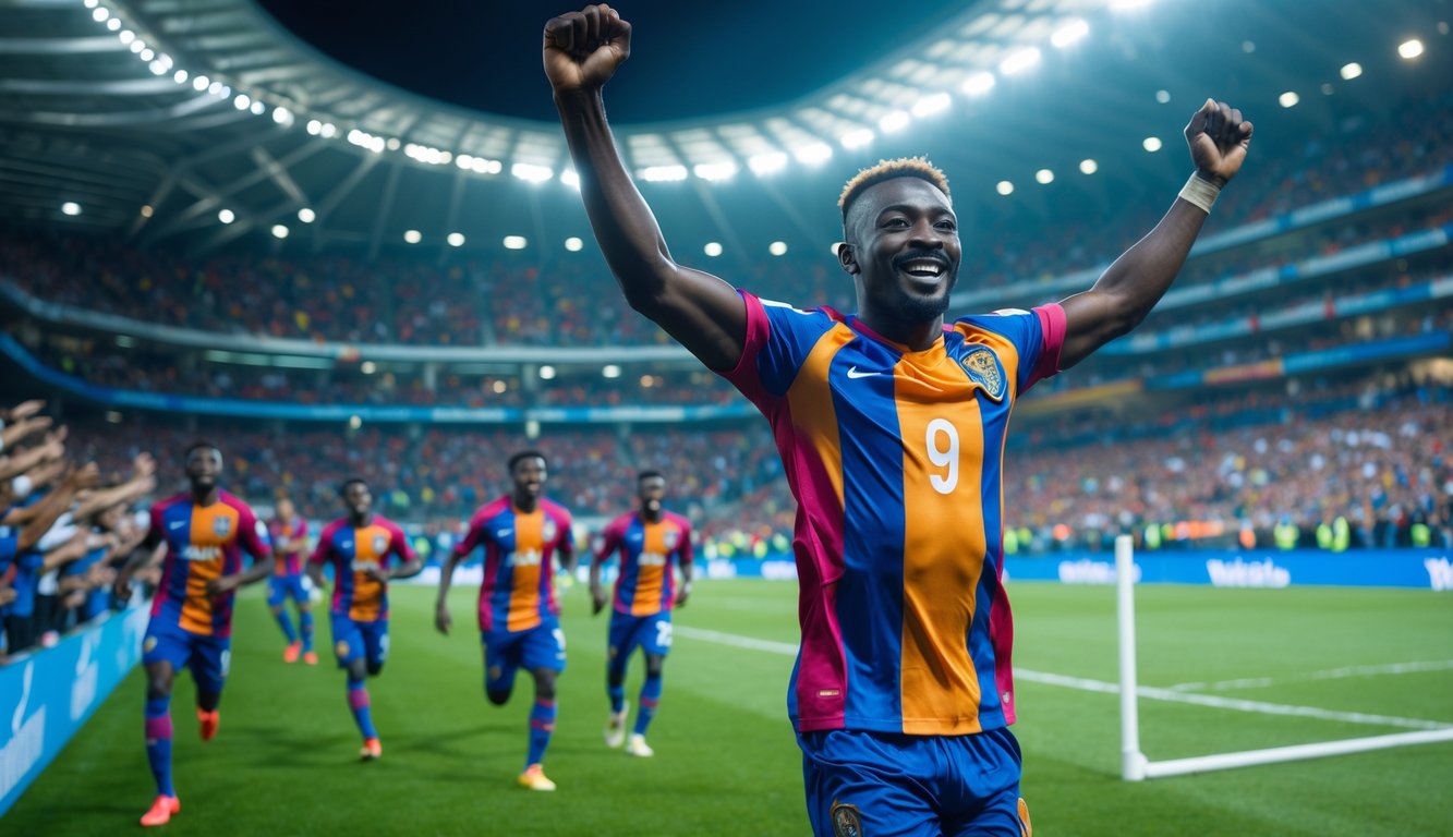 Seorang pemain sepak bola merayakan gol pertama di stadion yang ramai dengan penonton.