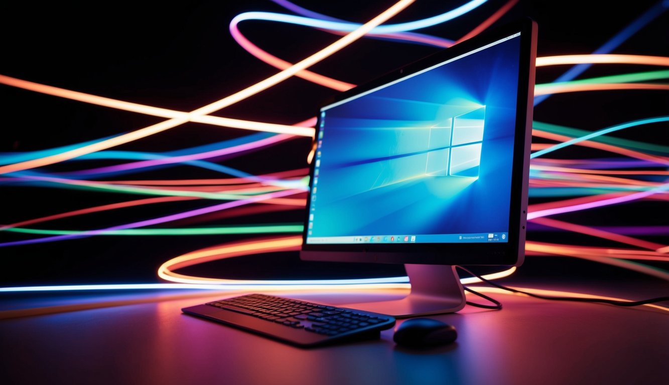 Sebuah layar komputer yang bersinar dikelilingi oleh garis dan bentuk berwarna-warni yang berputar