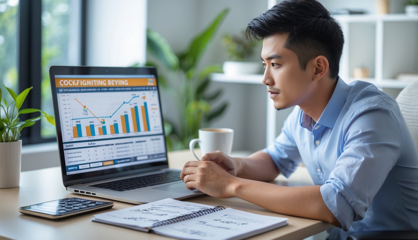 Seorang pria muda duduk di meja dengan laptop, mempelajari strategi sabung ayam dengan suasana ruangan yang terang dan rapi.