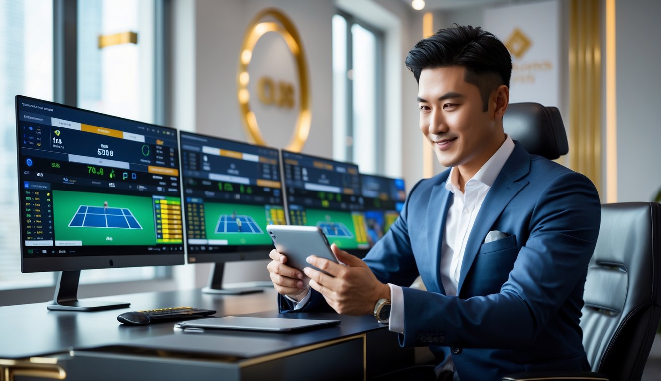 Seorang pria profesional duduk di meja dengan beberapa layar komputer yang menampilkan pertandingan tenis dan peluang taruhan, di dalam kantor modern yang elegan.